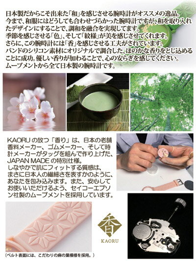 ◇ほのかに香る、やさしい和の腕時計 ◇季節を彩る色と日本の伝統紋様が美しい ◇和服に合うデザインは珍しい 日本製だからこそ出来た「和」を感じさせる腕時計がオススメの逸品。